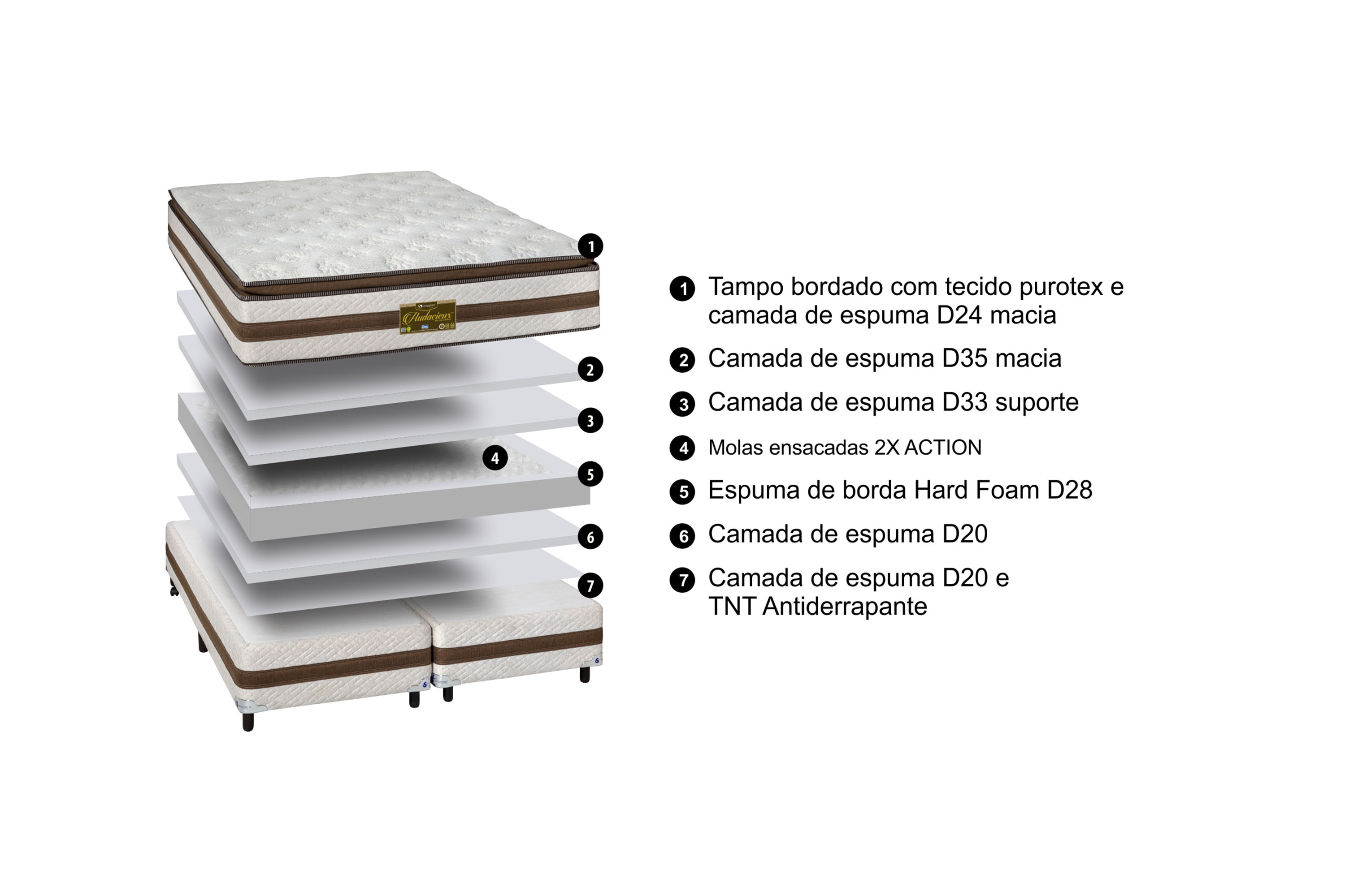 O Colchão Audacieux faz parte da linha premium, possuindo design e se destaca com seu bordado exclusivo de toque extremamente macio e confortável.